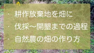 畑の開墾荒れた山を開拓して、丸太で登山道を作る。竹・葛の根を掘り起こして耕作地を拡げる 山の斜面を削って、平地を増やす、耕作放棄地から耕作地へ 耕作放棄地になっていた、 竹林・杉林の伐採後の状態。 大量の木々が散乱していて、 歩くのも一苦労。 まずは、歩ける道を作って、 少しずつ畑に戻していきたい。 ... 2019.02.20畑の開墾造成・整地